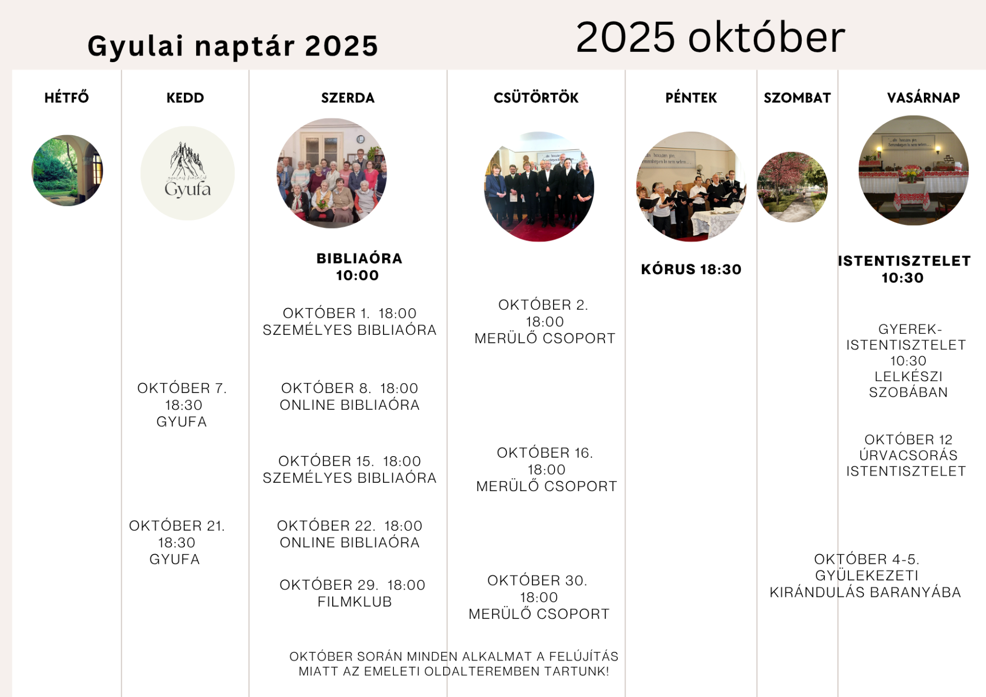 Istentiszteleteinket vasárnaponként 10.30-kor tartjuk, amelyet 13 órától elérhető YouTube csatornánkon.