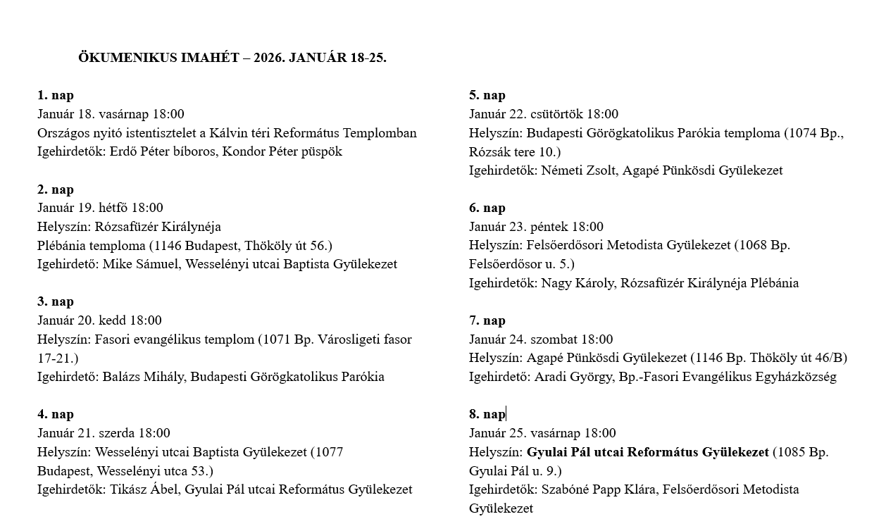 Egész héten imaheti alkalomra várjuk a testvéreket, a beosztás lentebb látható!